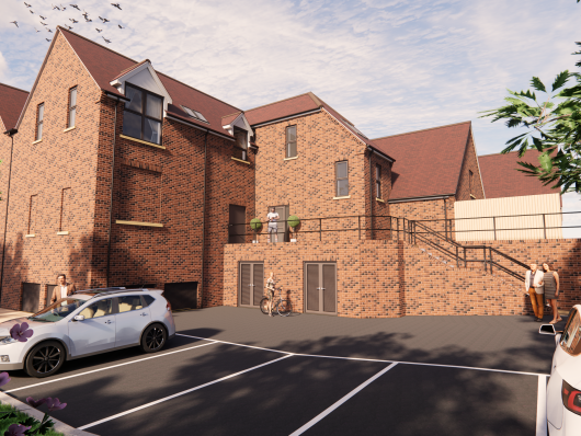 At second floor level, off an independent access, residential accommodation with new apartments provides a mixture of one and two bedroomed apartments. The new development is positioned at the upper level of the site out of the flood plain area with deliveries also being at the upper level from a vehicle layby positioned on the upper level. Due to its unique location abutting an existing car park in the centre of the town, the scheme utilises the existing car parking facilities.